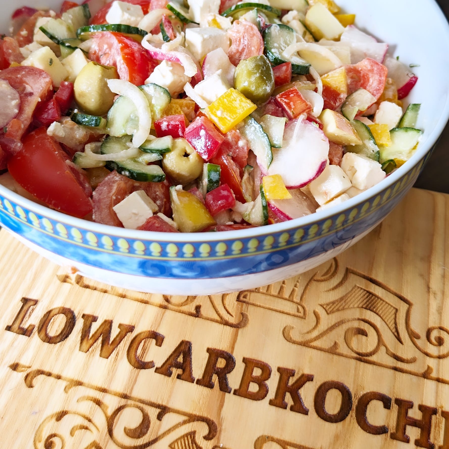 Die Idee, Feta mit Gemüse zu kombinieren, ist natürlich nicht neu, sie stammt aus der mediterranen Küche, wo man seit Jahrhunderten weiß, wie man Frische, Fett und Säure in Balance bringt. Der klassische griechische Salat (Choriatiki) besteht aus Tomaten, Gurken, Paprika, Zwiebeln, Oliven und Feta – ganz ohne Blattgrün. Unser Rezept spielt mit dieser Idee, aber macht sie moderner und etwas cremiger: Das Joghurtdressing sorgt für Leichtigkeit, während die Remoulade eine dezente Würze bringt.